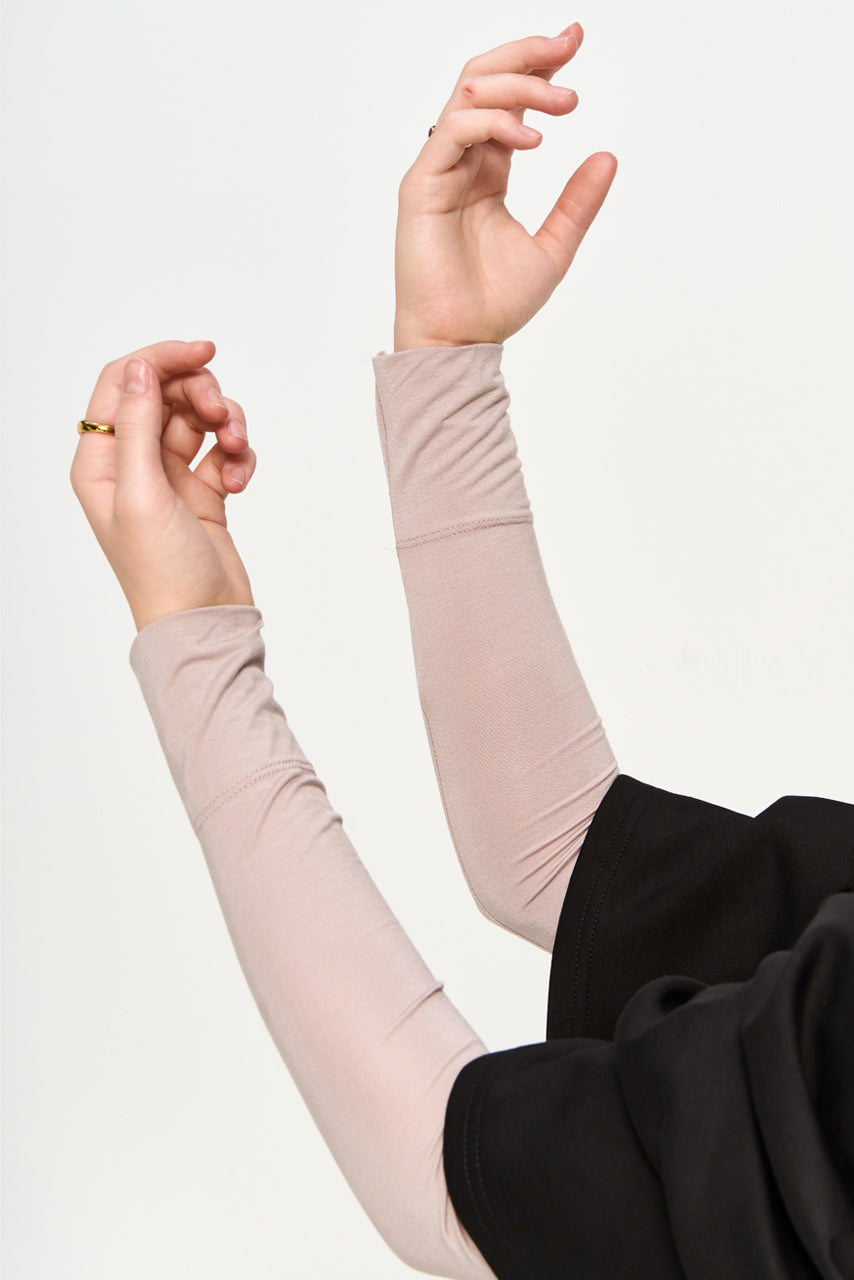 Arm sleeves are slip-on fabric tubes that cover the forearms, wrist, and arms up to the shoulders.
